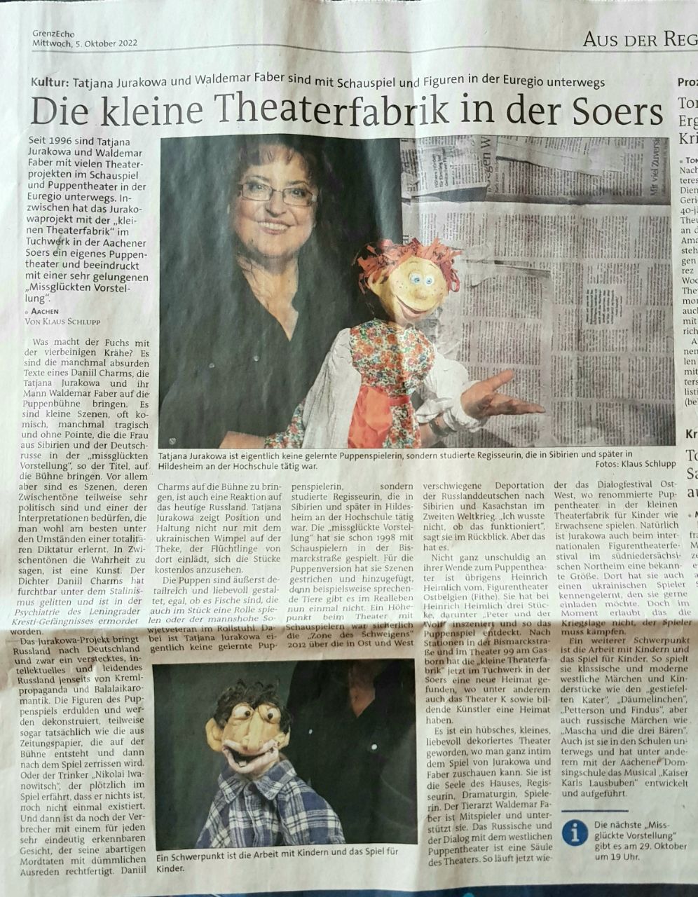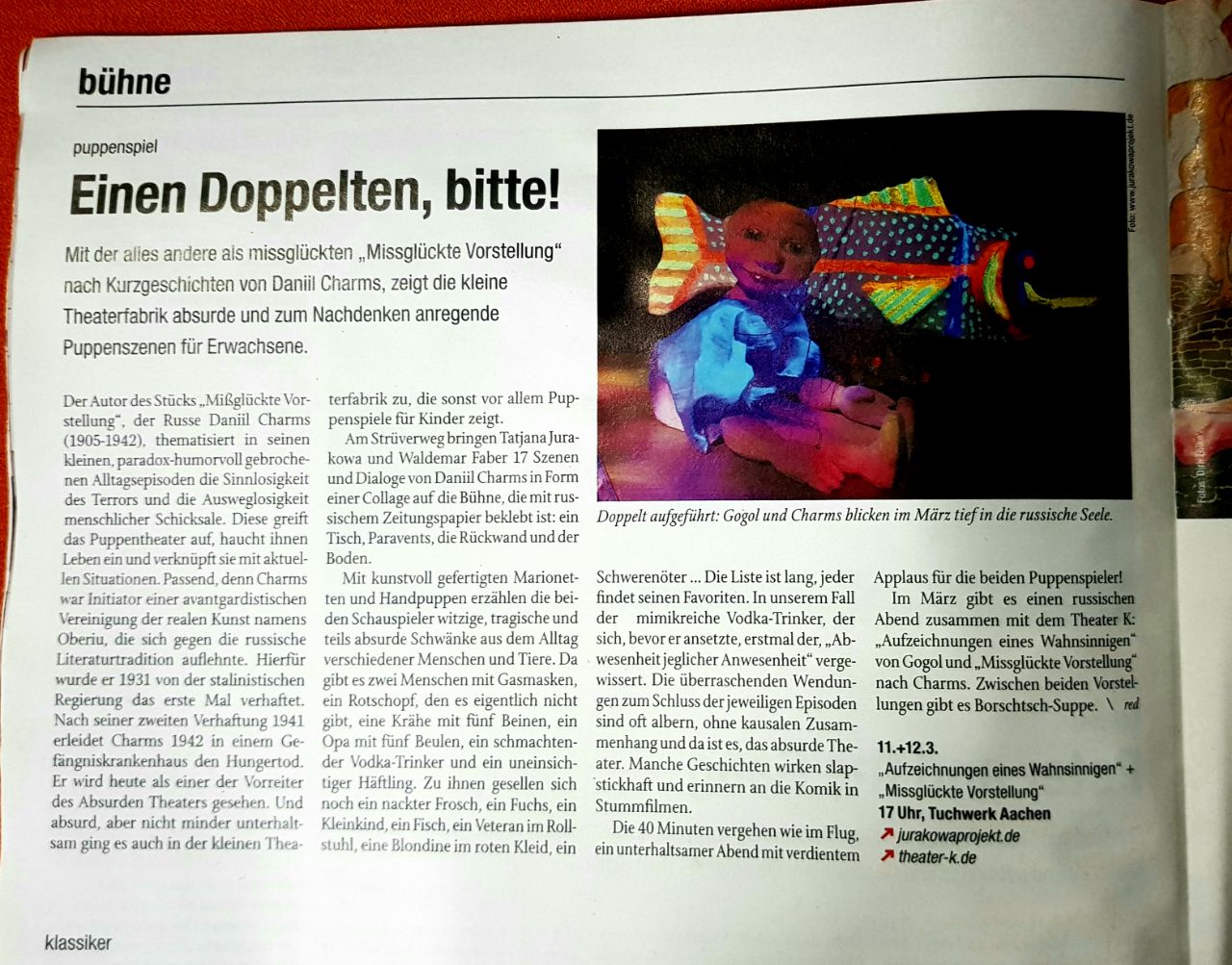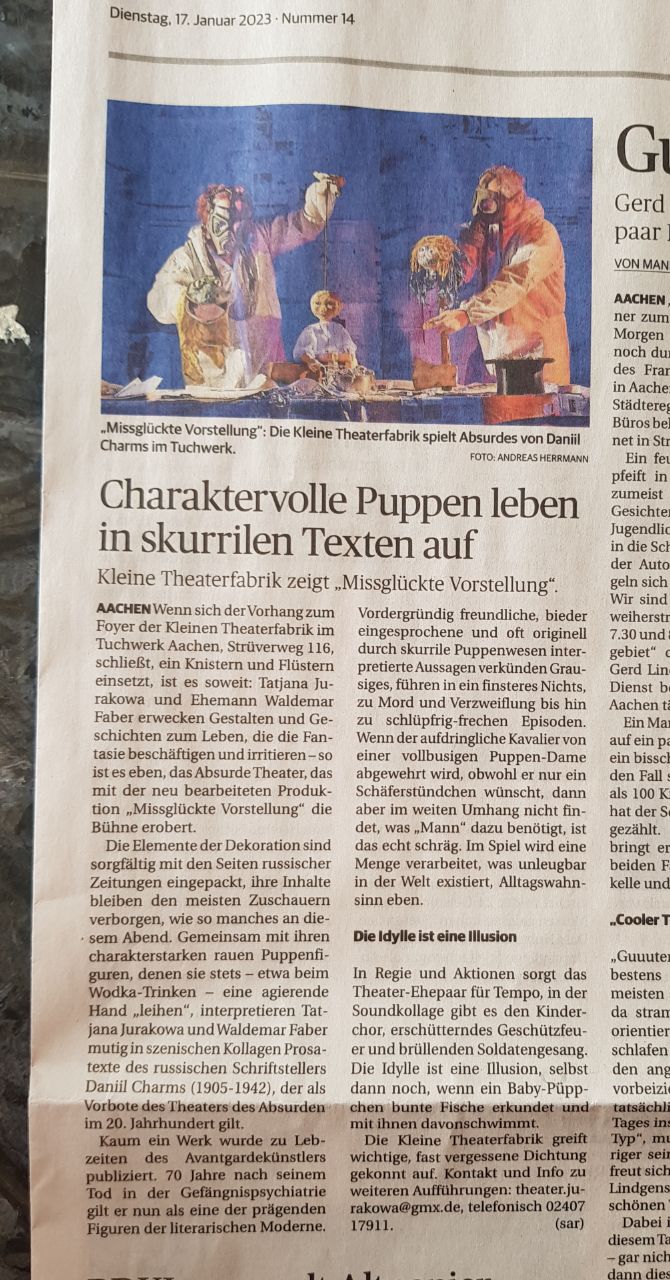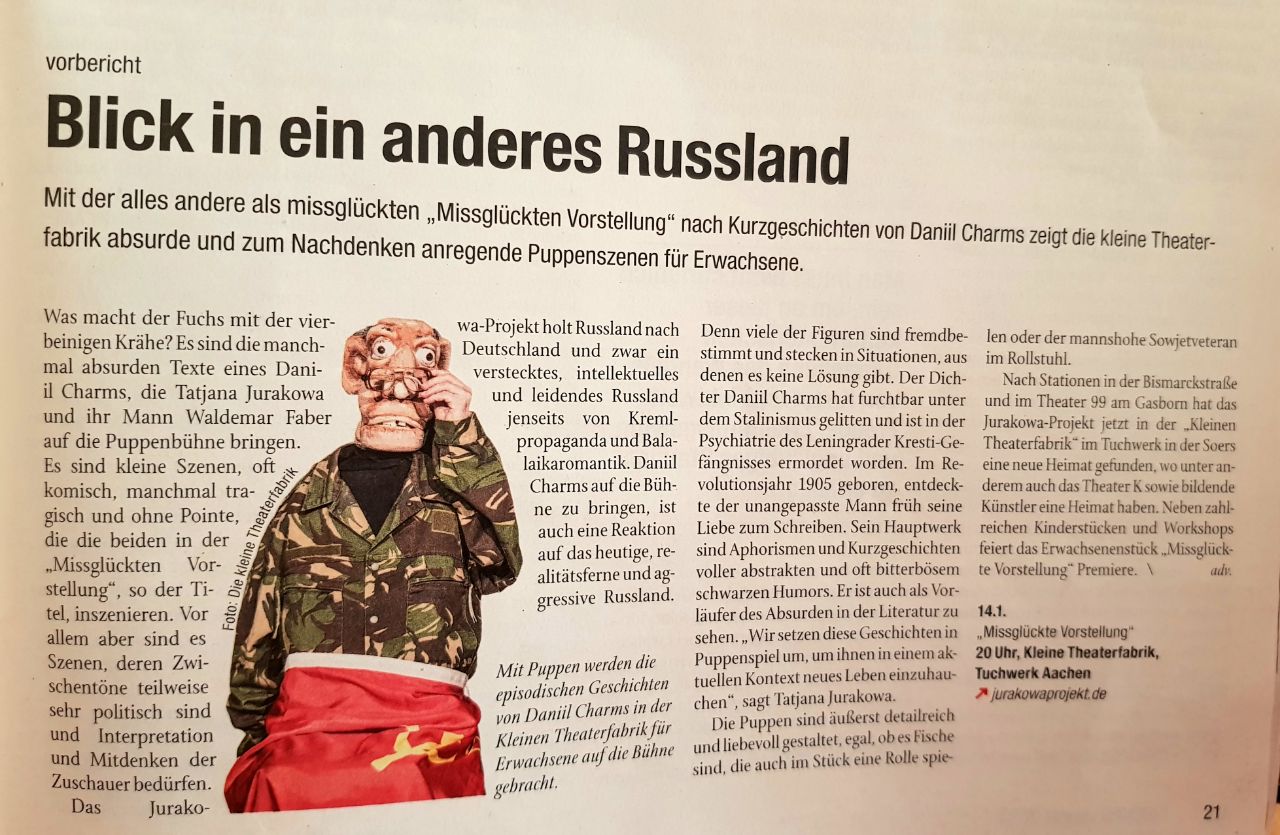 Das Theater Jurakowa-Projekt wendet sich wiederholt dem Werk von D. Charms zu, einem Vorboten der Literatur des Absurden des 20. Jahrhunderts. In seiner neuen Version erschafft das Figurentheater kurze Prosawerke in einer szenischen Collage, in der neben Menschen auch Tiere und unbelebte Objekte als gleichberechtigte Bühbenpartner agieren. Durch die Kollision der infantilen Wahrnehmung des „kleinen Menschen“ mit der grausamen Realität der sie umgebenden Welt erzeugt dieses Zusammenspiel eine einzigartige spielerische Atmosphäre. Herrlich skurril, unterhaltsam und witzig.